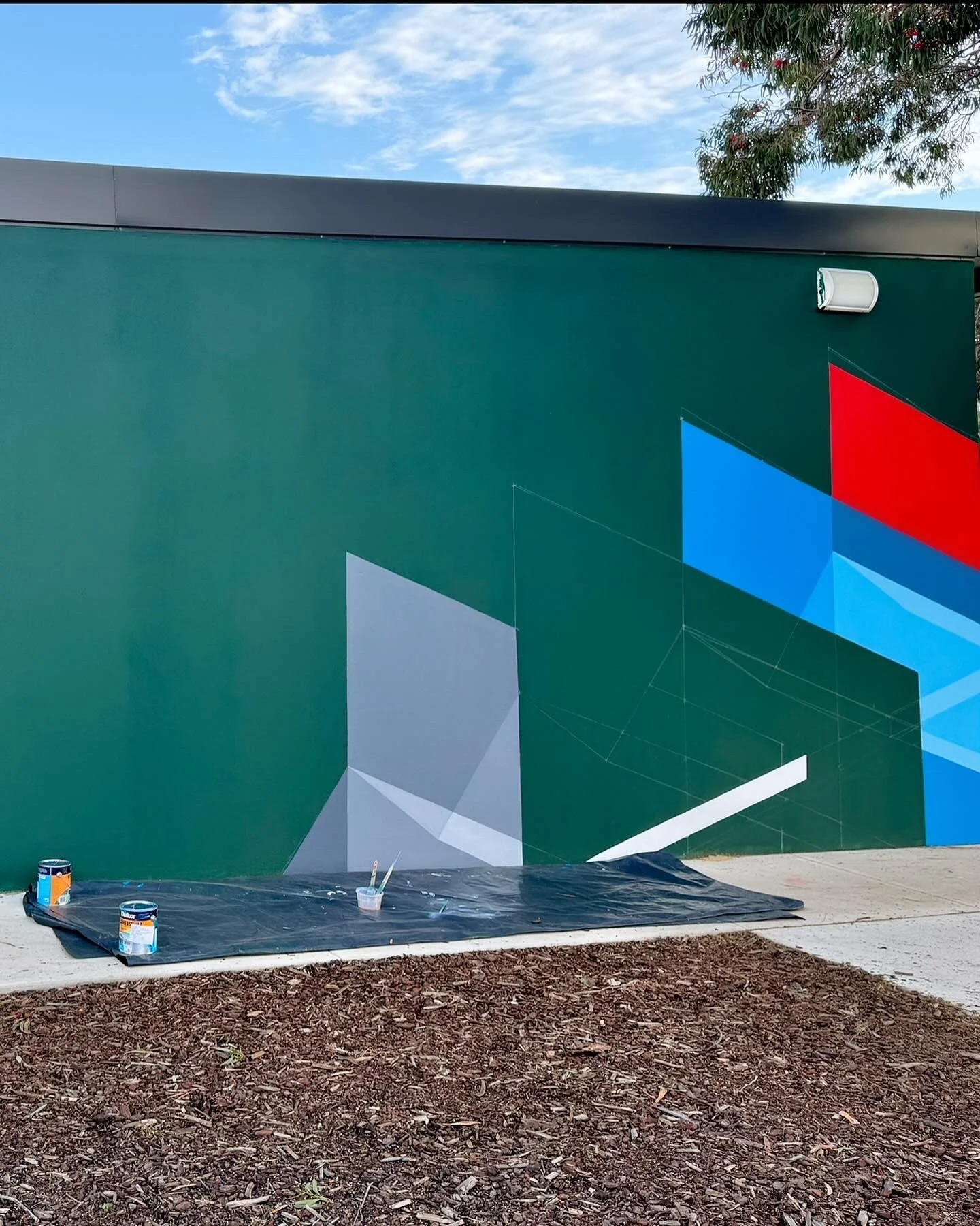 Commissioned by the City of Stirling, ‘Our Identity’ brings together the different layers and elements that give the Bennett Park sporting facility and the surrounding Doubleview community its identity. Each geometric element and colour represent the various elements within the community which are encompassed by a strong sporting influence. ‘Our Identity’ incorporates two walls at the Bennett Park sporting facility. The end result is a very striking piece made up of bold colours and geometric elements, giving a layered, 3D effect.